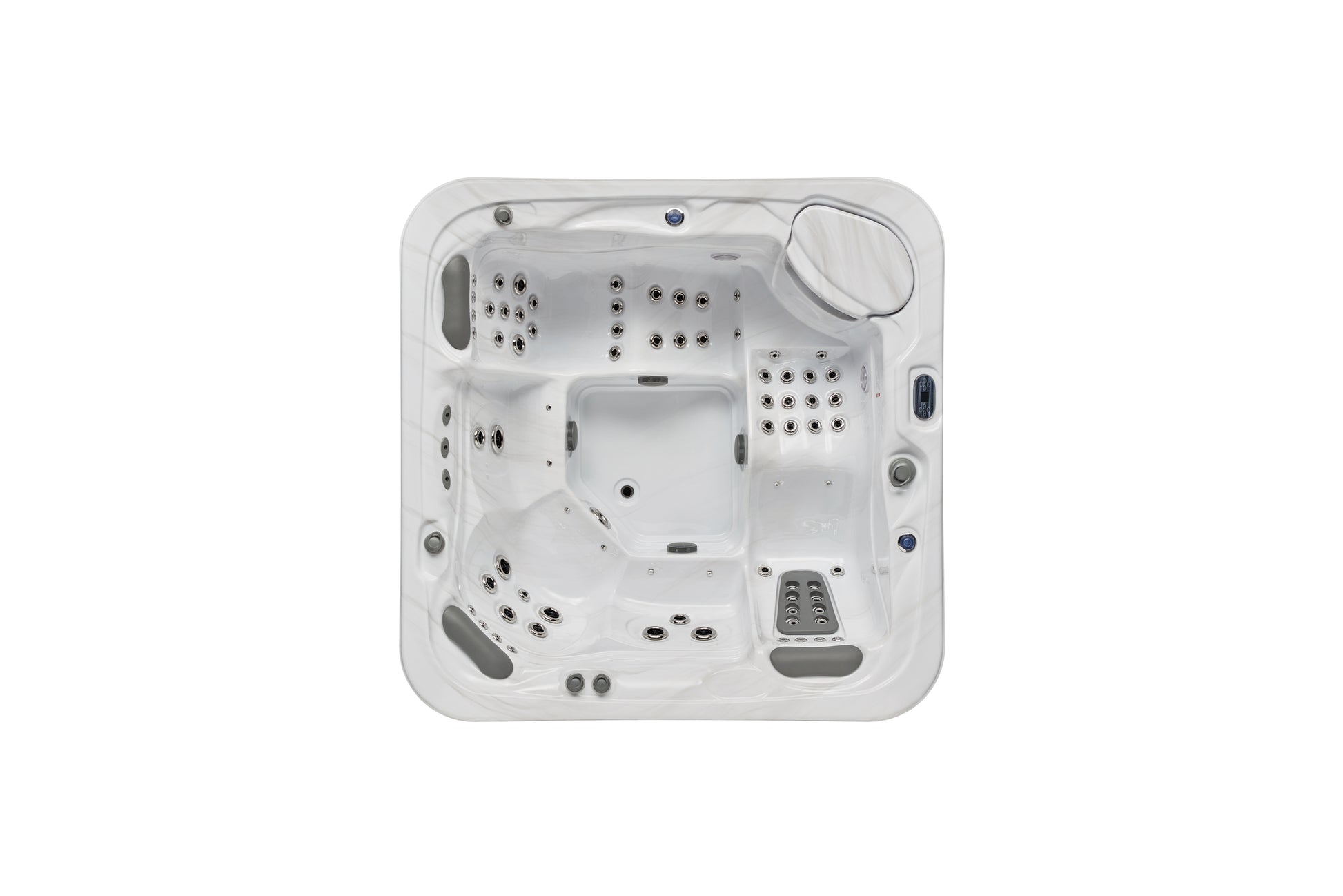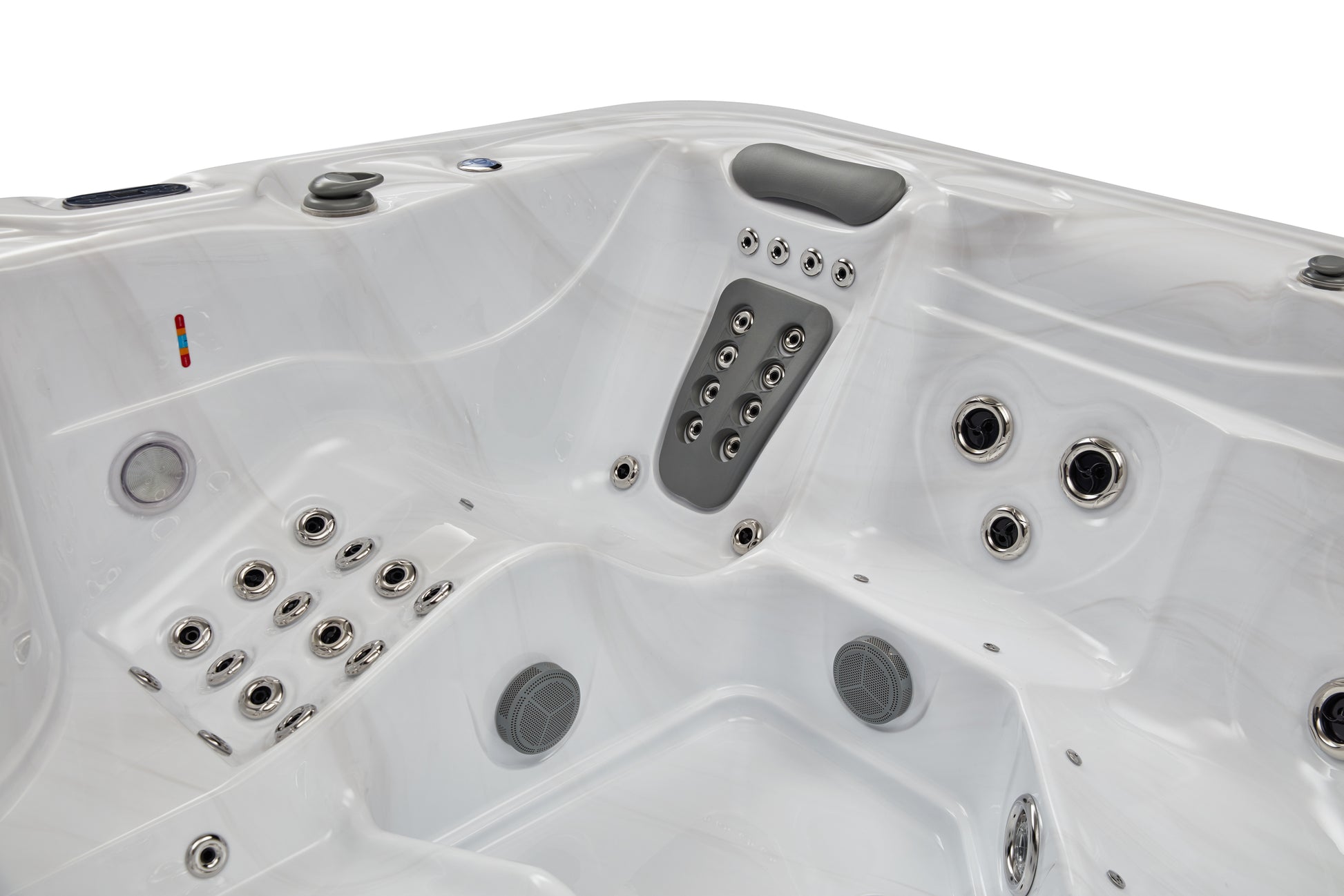 The Infinity luxury home spa with seating for 5 features 2 lounge seating options and 3 ergonomic bucket seats. A total of 77 adjustable stainless steel water jets s and 8 soothing air bubble jets provide the ultimate hydromassage experience. This spa also includes 2 pop-up water spouts and a bonus 3-tier water column for a relaxing and soothing waterfall experience. Two multi-speed pumps provide ample power for the strategically targeted massage jets that provide therapy for both the upper and lower back and legs. A separate filtration pump ensures the water continues to circulate while the spa is not in use keeping the water clean and sanitary. Full foam insulation improves energy efficiency and reduces operating costs in colder climates.