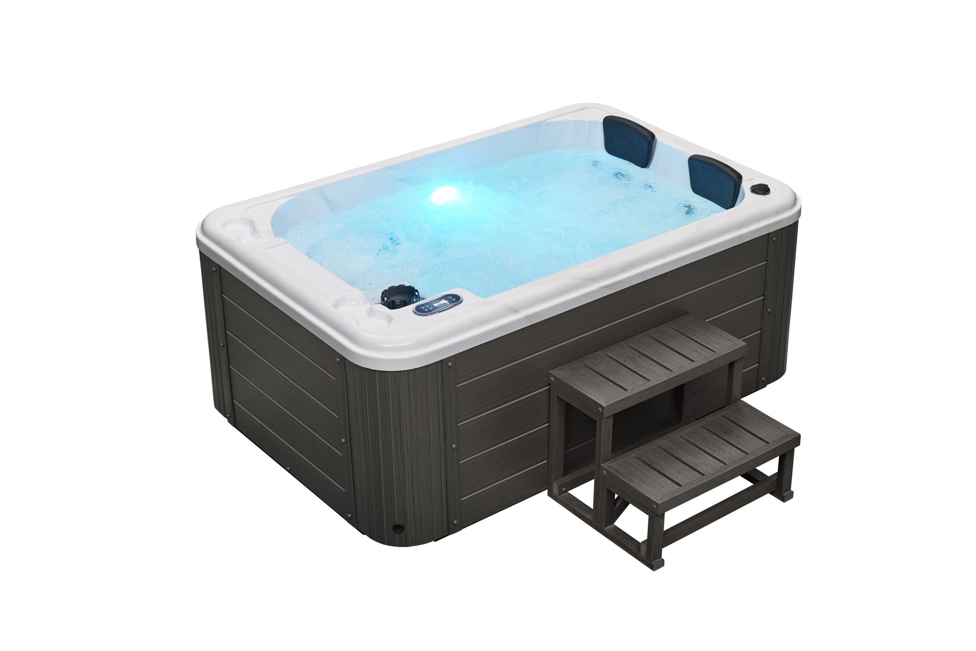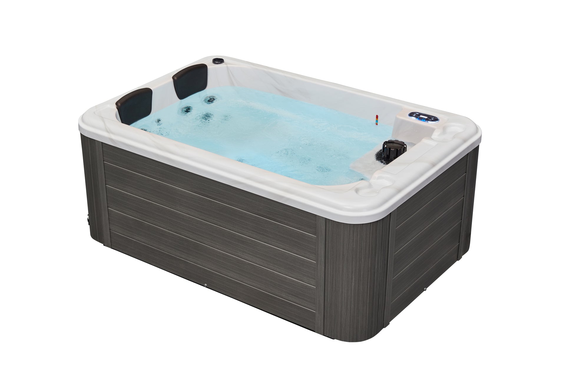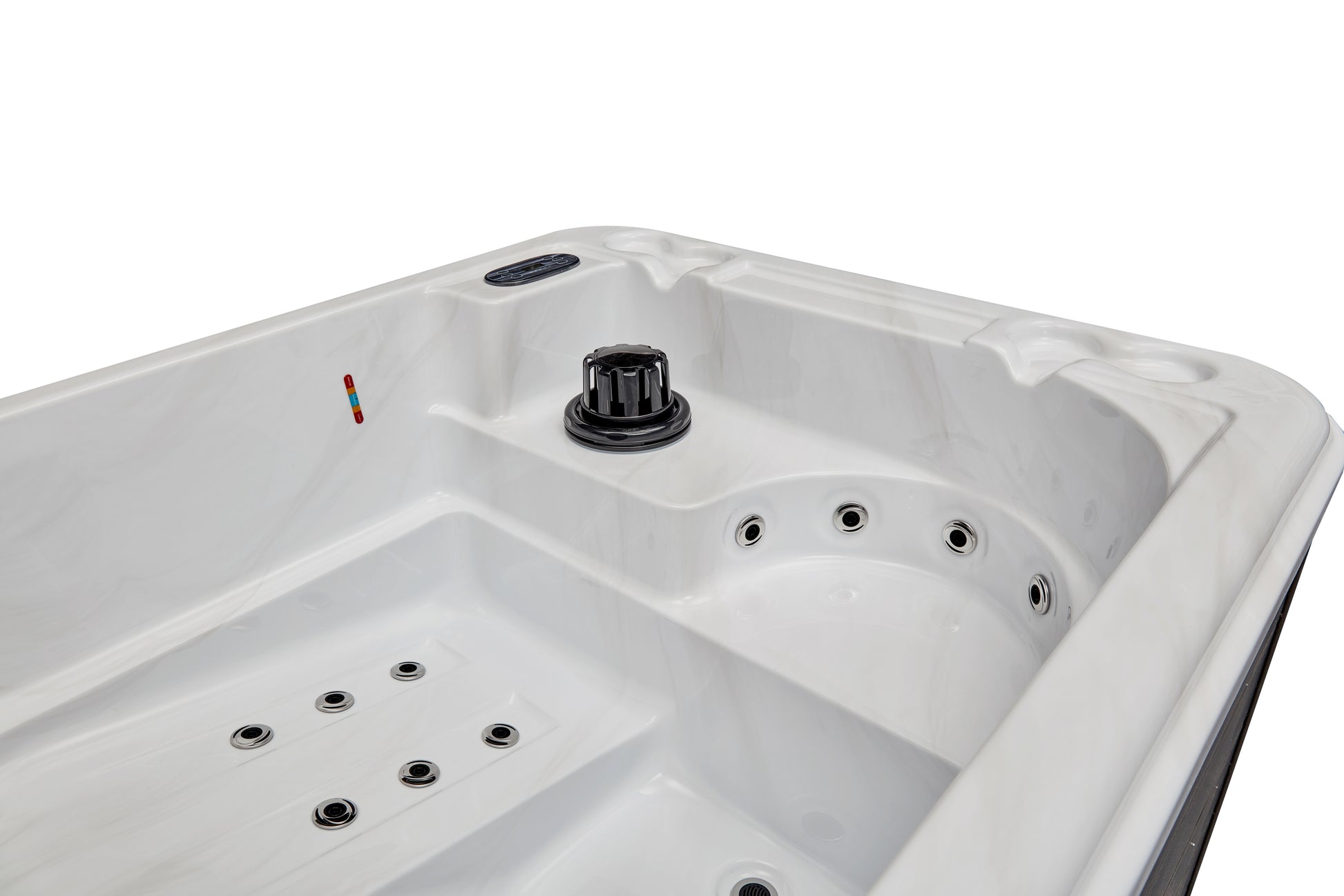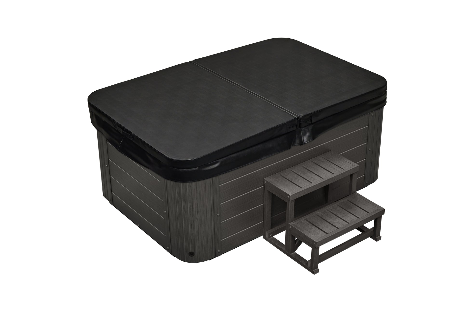 The Riley 3-person home spa with cloud grey interior features two spacious lounge seats and 26 total jets packing a lot of power into a compact design. The Riley is designed to provide all the features of larger luxury spas in a smaller footprint. It is 31 inches deep and 77 inches long providing a deep soak with plenty of room to stretch out and relax. The multi-color underwater LED lighting system will provide a relaxing environment while the strategically positioned back, foot and leg massage jets provide a complete lower body massage. Insulated spa cover and premium steps included. (A $495 value!)