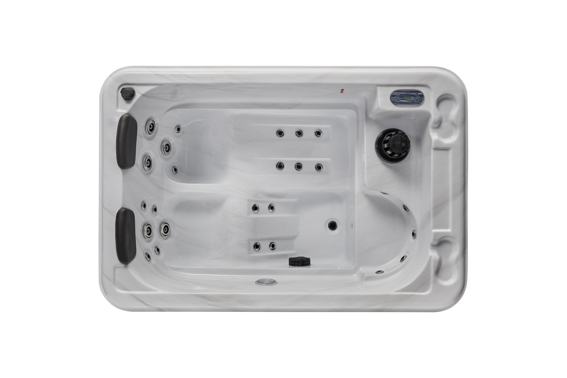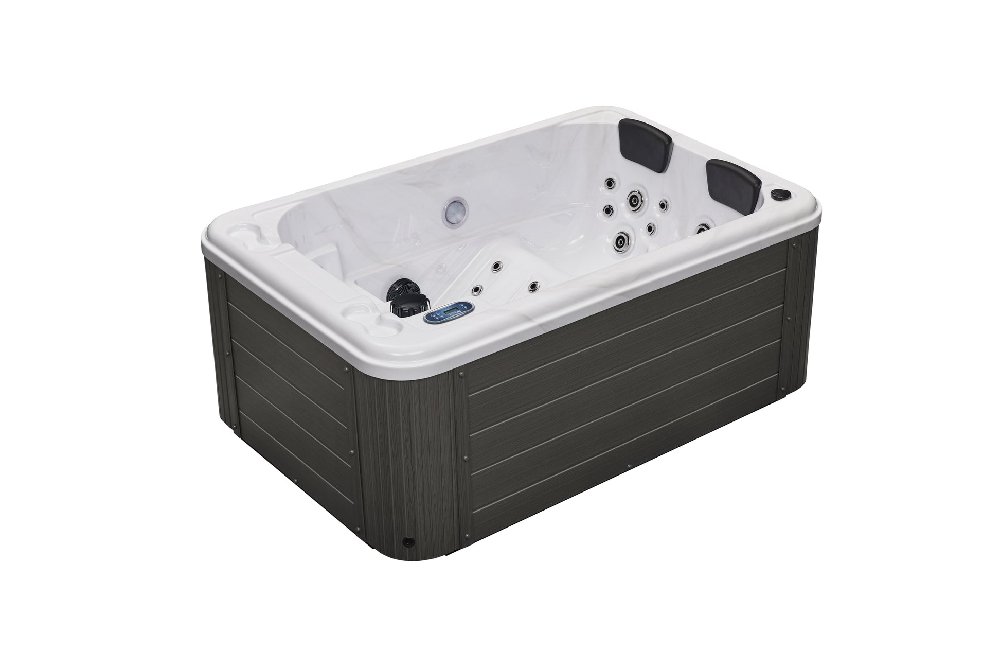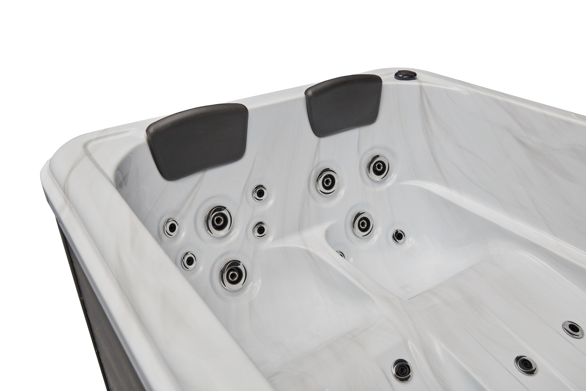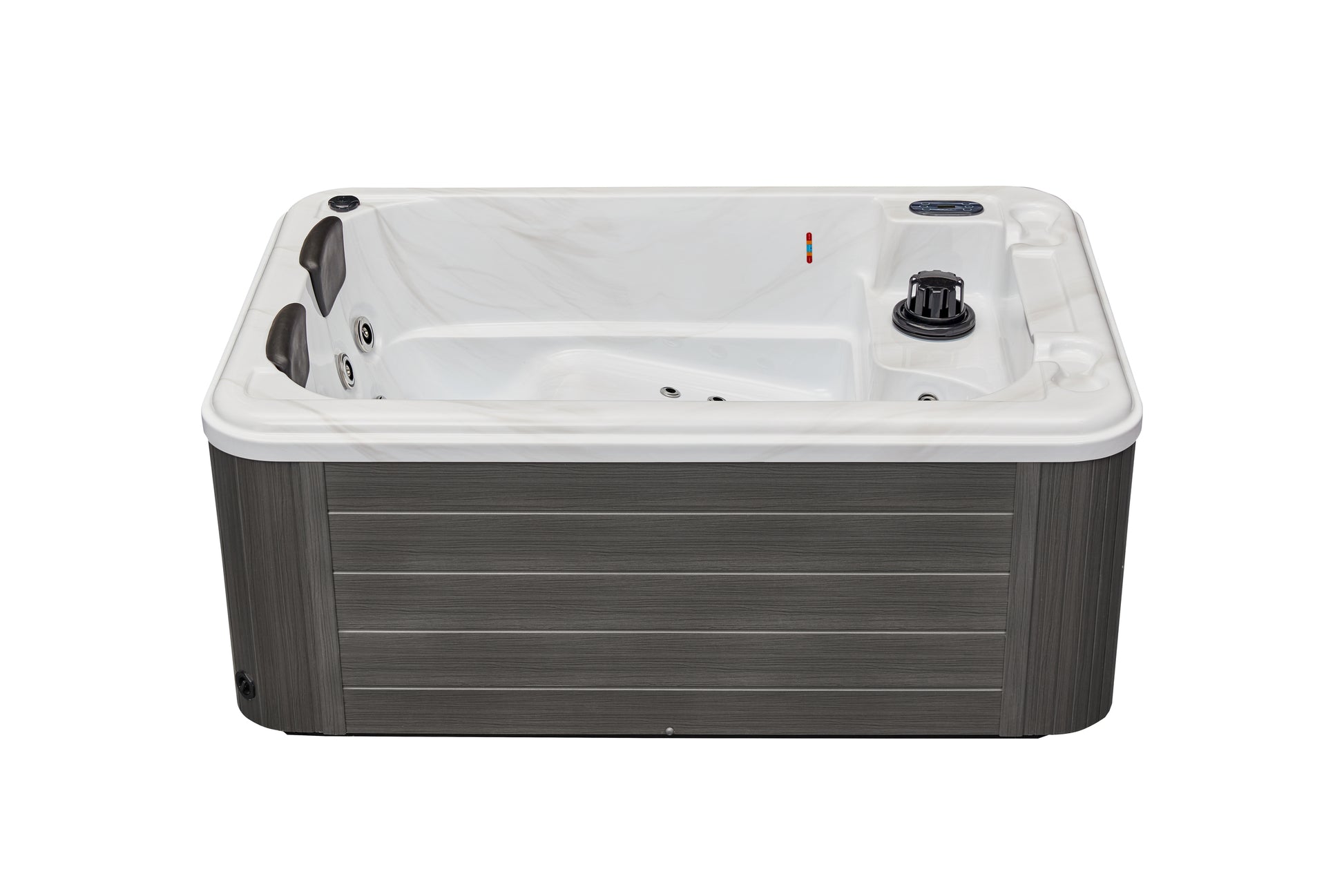 The Riley 3-person home spa with cloud grey interior features two spacious lounge seats and 26 total jets packing a lot of power into a compact design. The Riley is designed to provide all the features of larger luxury spas in a smaller footprint. It is 31 inches deep and 77 inches long providing a deep soak with plenty of room to stretch out and relax. The multi-color underwater LED lighting system will provide a relaxing environment while the strategically positioned back, foot and leg massage jets provide a complete lower body massage. Insulated spa cover and premium steps included. (A $495 value!)
